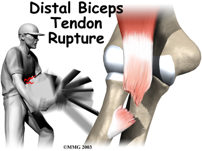 부상정도가 심각하거나 과사용이 지나치게 축적되면 힘줄이 점점 닳아 결국에는 끊어질 것이에요. 팔꿈치나 어깨를 어색하게 움직일 때, 혹은 비틀리거나 관절이 쭉 펴진 상태에서 넘어질 경우 부상으로 인해 힘줄이 찢어질 수 있어요. 팔꿈치 관절에서 무거운 물체를 들다가 종종 힘줄이 파열됩니다. (예를 들어 소파나 냉장고를 옮기다가)
