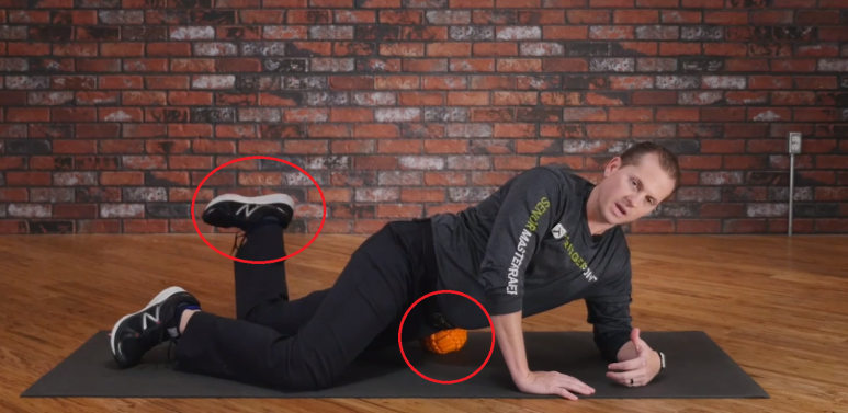 마사지 볼 등을 이용해 TFL을 압박한 뒤 무릎을 굽힌 후 고관절의 내회전/외회전을 부드럽게 반복한다. 점차 공이 깊숙히 들어가면서 TFL과 중둔근에 트리거 포인트가 사라지길 기다린다. (약 2분 내외)