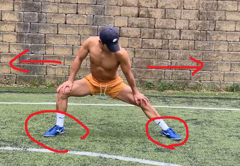 그 다음 그것을 이용해 고관절 내전근과 외(회)전근의 밸런스를 맞춘다. 자리에 일어서서 위 원리를 계속 적용하면서 좌/우로 움직여준다.
