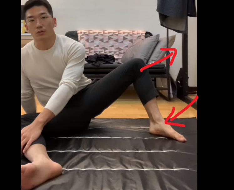 바닥에 앉아 위와 같이 지렛대의 원리를 이용해 고관절을 외회전 시켜준다.
