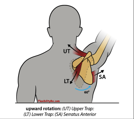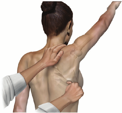 어깨 관절에서 굴곡/외전이 일어나는 동안 보조자에 의해 날개뼈 상방회전을 도움받을 수 있다. 혼자서 실시할 때는 바닥에 누워 반대손으로 날개뼈 하각을 잡고 천천히 어깨를 굴곡하면서 하각을 전방으로 당겨 날개뼈의 상방회전을 도울 수 있다.