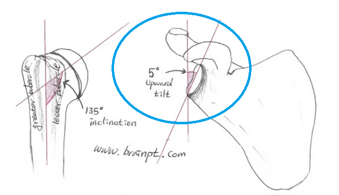 두 번째로, 상완골의 탈구 스트레스이다. 안정시 날개뼈 소켓은 중력선을 기준으로 약 5˚ 상방을 바라보고 있다. 그래서 상완골 머리가 옆에 뚝 붙어있는게 아닌 약간 얹혀져 있어 아래쪽으로 탈구되지 않도록 해준다. 그러나 날개뼈가 하방회전되면 상완골이 중력에 100% 노출되게 되고, 이는 GH관절에 지속적인 아래쪽으로의 탈구 스트레스를 발생시킨다.