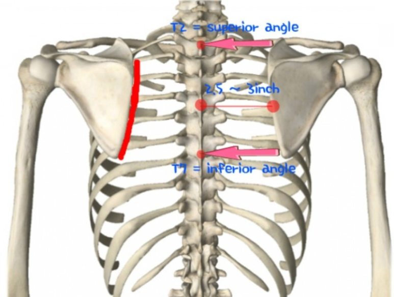 고개를 가볍게 숙였을 때 가장 많이 돌출된 부분이 경추 7번(C7)이다. 그 아래를 따라가면서 흉추 2번(T2)을 찾고 표시해 둔 뒤 안정시 날개뼈 위치와 비교한다. 본래 날개뼈 상각은 흉추 2번(T2)과 거의 동일선 상에 위치한다.