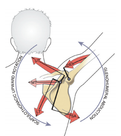 어깨의 경우에도 미끄러지는 팔에서는 날개뼈의 상방회전이 일어난다. 대부분의 어깨 환자들이 팔을 머리 위로 들어 올리는 과정에서 상완골이 충분히 외회전 되지 않거나, 날개뼈가 충분히 상방 회전되지 않는다. 수영은 기본적으로 외회전 토크를 이용하기 때문에 물에서 미끄러지는 과정에서 상완골은 충분히 외회전 되고 전거근에 의한 날개뼈 하각의 적절한 전인+상방 회전도 유도한다. 이러한 이유들로 인해 이따금씩 병원에서는 수영을 재활 운동으로써 추천하기도 한다.