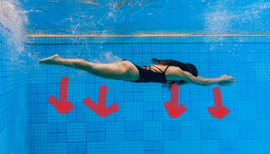 수영은 그 반대이다. 우리가 물에 엎드려서 만약 달리기처럼 우리 몸 뒤로 추진력을 발생시키면 어떻게 될까? 물을 내 뒤로 밀어내면 당연히 내 몸은 가라앉을 것이다. 때문에 수영을 처음 접하는 사람이라면 당연히 익숙한 방법(우리 몸 뒤로 차는)으로 힘을 쓸 수밖에 없고, 이는 몸을 계속 가라앉히게 된다.