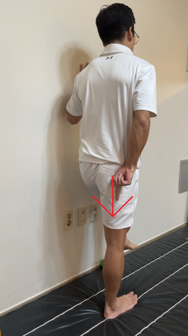 - 중둔근 약화가 의심되는 한 발로 자리에 서서 좌골을 옆으로 열어주고 짝다리를 짚습니다.