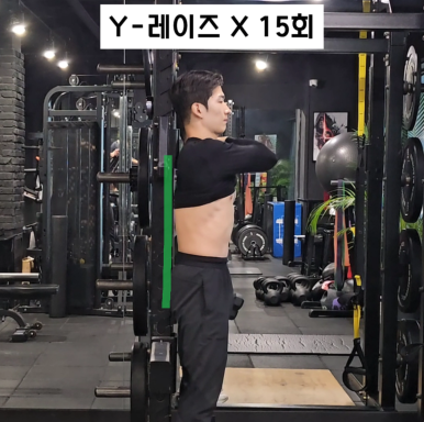 이 상태에서 양 팔을 Y 모양으로 들어 올려줄 것입니다. 이때 양 팔은 완전히 옆이 아니라 "아주 큰 달걀을 쓰다듬는다는 느낌"으로 양 팔이 약간 앞에서 들어올려질 수 있게 해주세요. (불필요한 어깨 찡김을 예방하기 위해 Scapula plane에서 움직임)