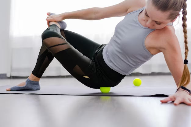 무릎 통증을 호소하는 환자들은 약한 둔근을 가지고 있으면서 동시에 심부 외회전근은 단축된 경향을 보입니다. 마사지 볼을 엉덩이 아래에 두고 발을 4자로 꼬아줍니다. 몸을 약간 틀어 엉덩이의 아래 측면 부위를 빙글빙글 원을 그리며 마사지해 줍니다.