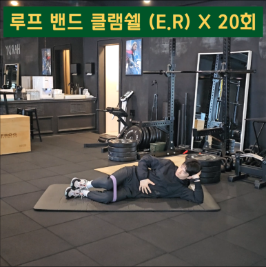 ▶ 루프 밴드를 무릎 위 허벅지에 착용하고 옆으로 눕는다.