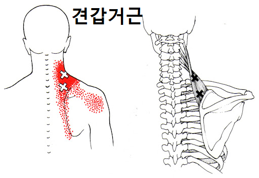 많은 현대인들이 목과 어깨 통증을 호소합니다. 대부분의 사람들이 "승모근"이라고 표현하지만 정확히는 "견갑거근" 통증에 가깝습니다. 아래는 승모근과 견갑거근의 위치와 통증점을 간단히 비교한 그림입니다.