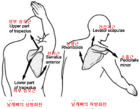 (1) 팔을 머리 위로 올리는 동작에서는 승모근과 전거근이 사용되어 날개뼈가 위쪽으로 회전하고