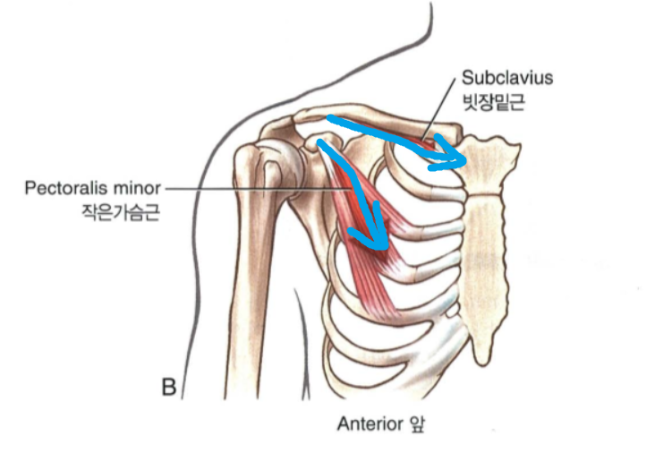 머릿속으로 한번 그려보자. 날개뼈가 하방 회전되면 AC 관절을 끌고 같이 내려가게 된다. 그럼 쇄골의 바깥쪽은 SC 관절을 축으로 시소처럼 하강하게 된다. 쇄골이 하강하면 쇄골 아래로 지나가는 혈관과 신경을 압박해 2차적인 불편감을 가져올 수 있다.