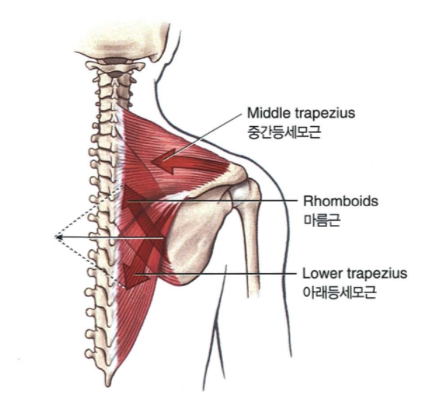 소흉근도 마찬가지, 힘선을 보면 오훼돌기를 갈비뼈 방향으로 끌어내리는 것을 볼 수 있다. 그런데 머릿속으로 다시 그려보자. 소흉근이 오훼돌기를 끌고 갈비뼈 전면 방향을 향해 당기면 날개뼈는 전방경사지면서 뒤쪽에서 날개뼈 하각이 붕 뜨게 될 것이다. 이것을 막기 위해서 하부 승모근도 같이 수축하는 것이다.