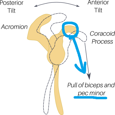 날개뼈를 거상 시켜주는 근육들에 문제가 생기면 날개뼈는 하강+전인+하방회전을 보이게 된다. 이렇게 되면 우측 그림과 같이 상완골은 중력에 의해 아래로 끌려가게 된다. 이러한 스트레스가 지속되면 GH 관절 아래쪽으로 탈구 스트레스를 계속 주게 되고, 이를 보호하기 위해 어깨 주변 근육(특히 이두근과 회전근개)은 더더욱 긴장하게 된다.